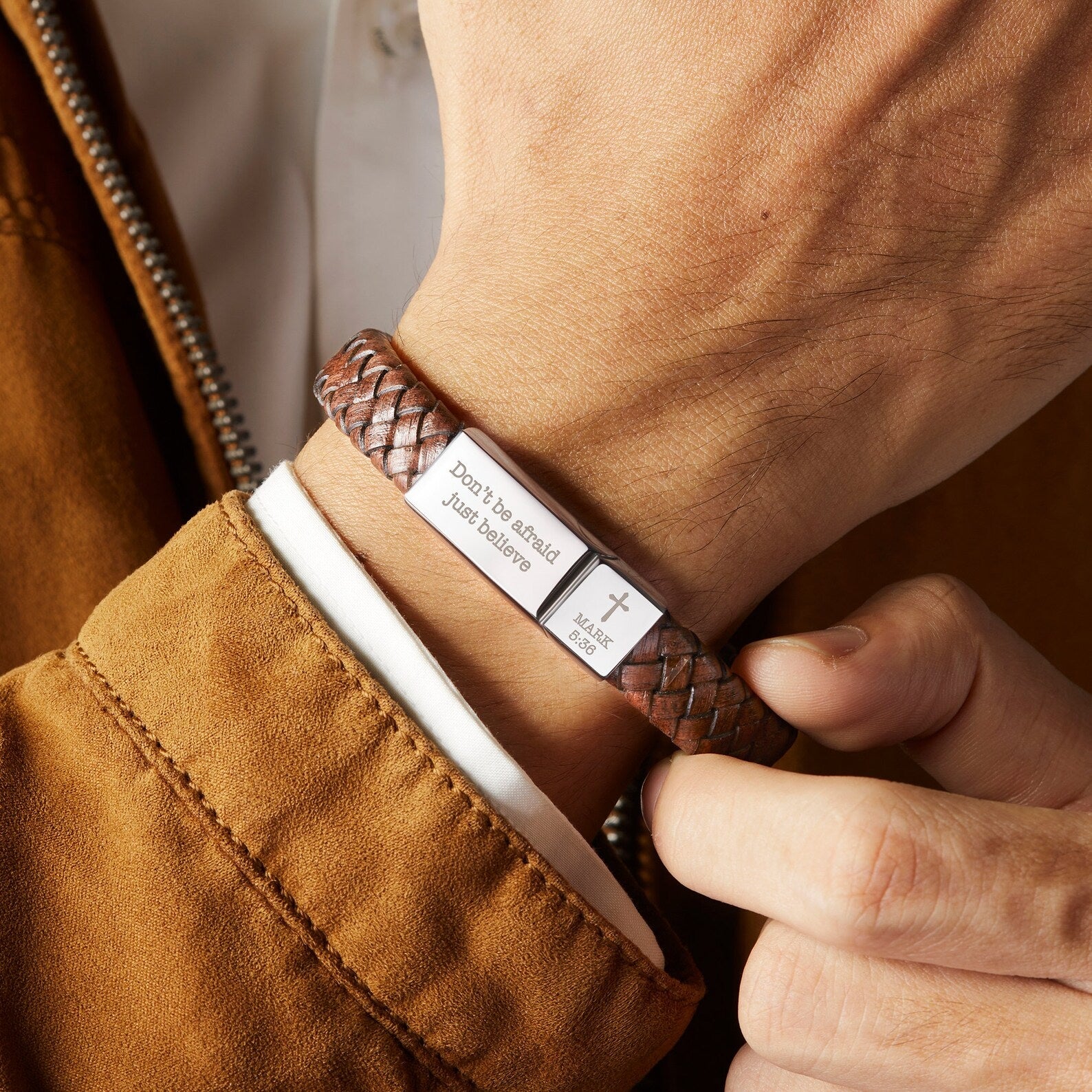 This is a perfect woven leather bracelet for anybody who believes in God. On one side, you can have your favorite quote from the Bible. There will be a fixed cross and you can also personalize your Christian favorite verse.
